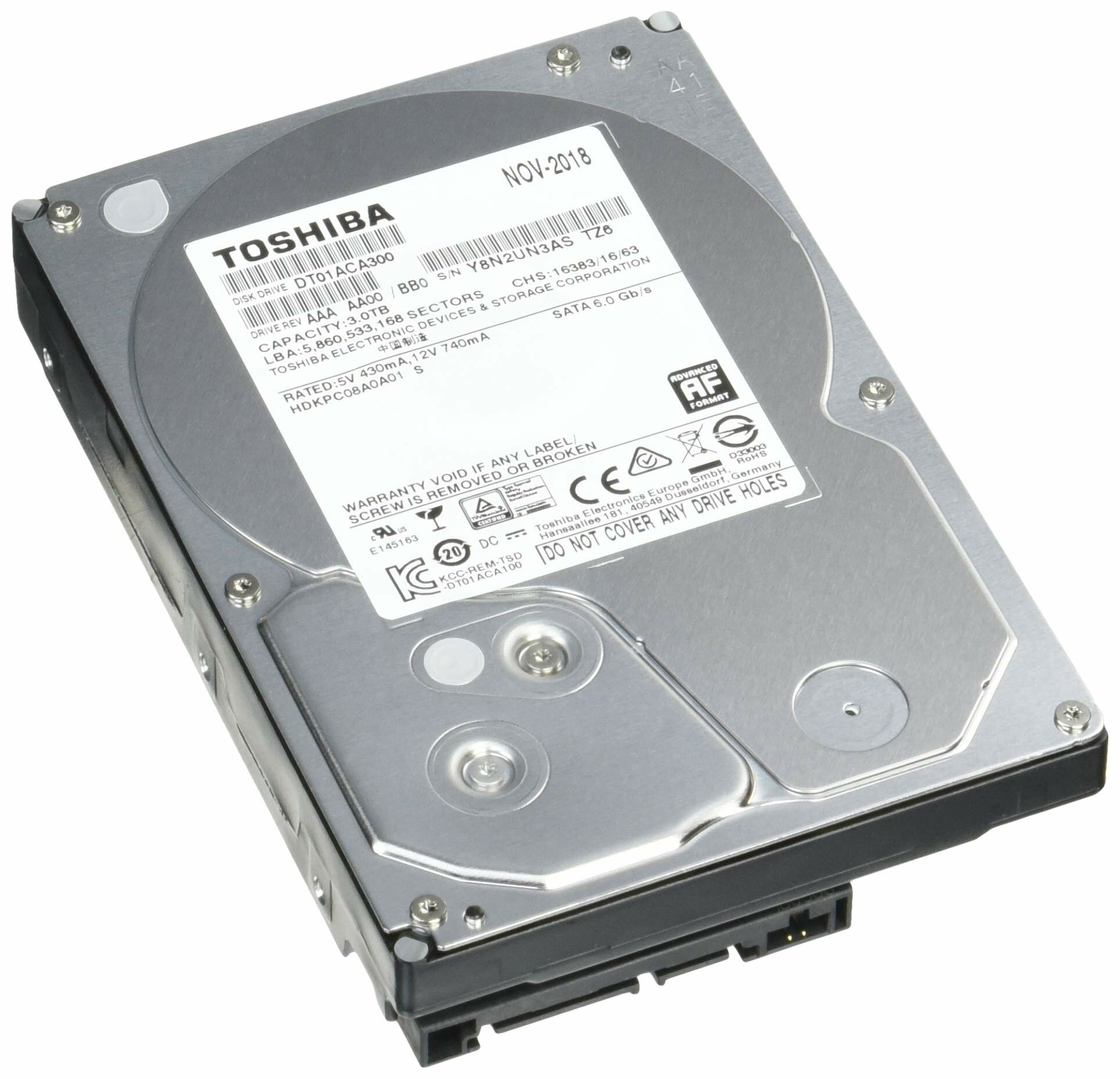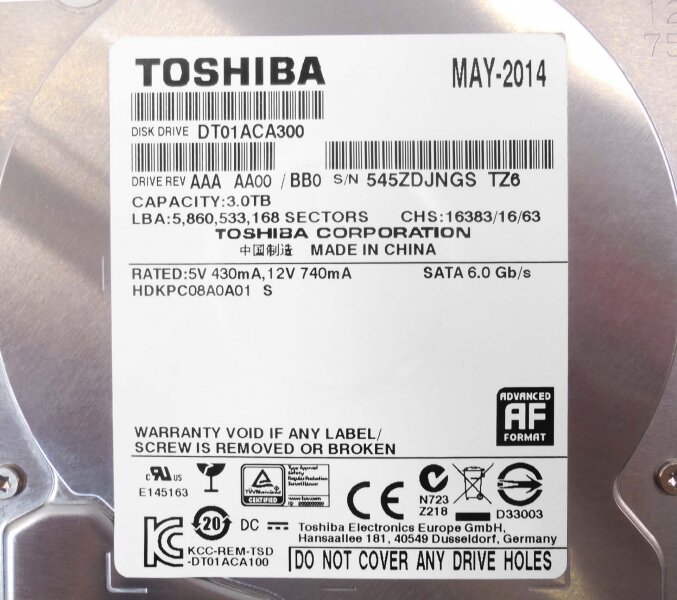 3.5" 3 ТБ Жесткий диск Toshiba DT01 (DT01ACA300) - SATA III, 6 Гбит/с, 7200 об/мин, кэш память - 64 МБ