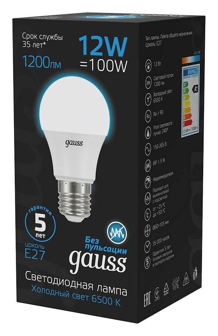 Светодиодная лампа Gauss A60 12W 1200lm 6500K E27 LED 1/10/50