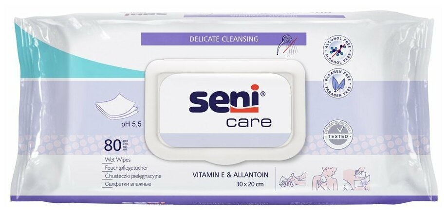 Салфетки влажные 80 шт. SENI CARE для ухода, с витамином Е и Аллантоином, SE-231-WK80-001 В комплекте: 1шт.