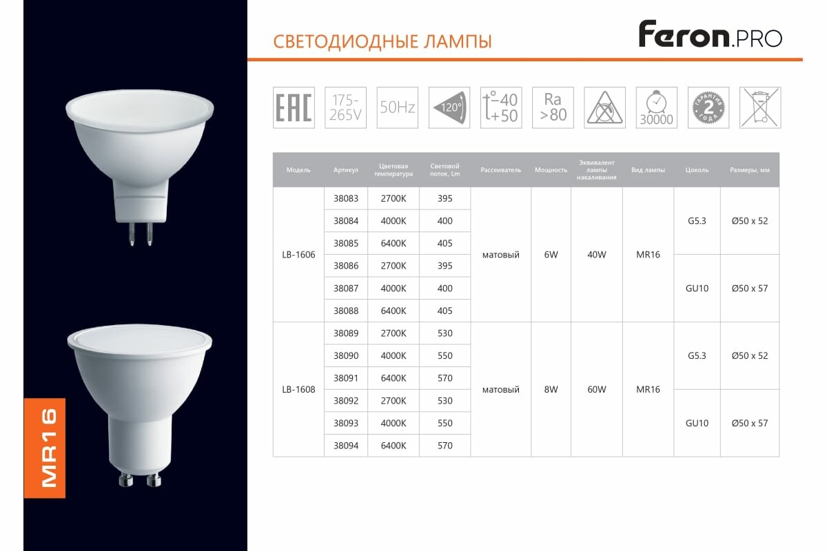 Лампа светодиодная .PRO LB-1607 GU10 7W 6400K, FERON 38178 (1 шт.)