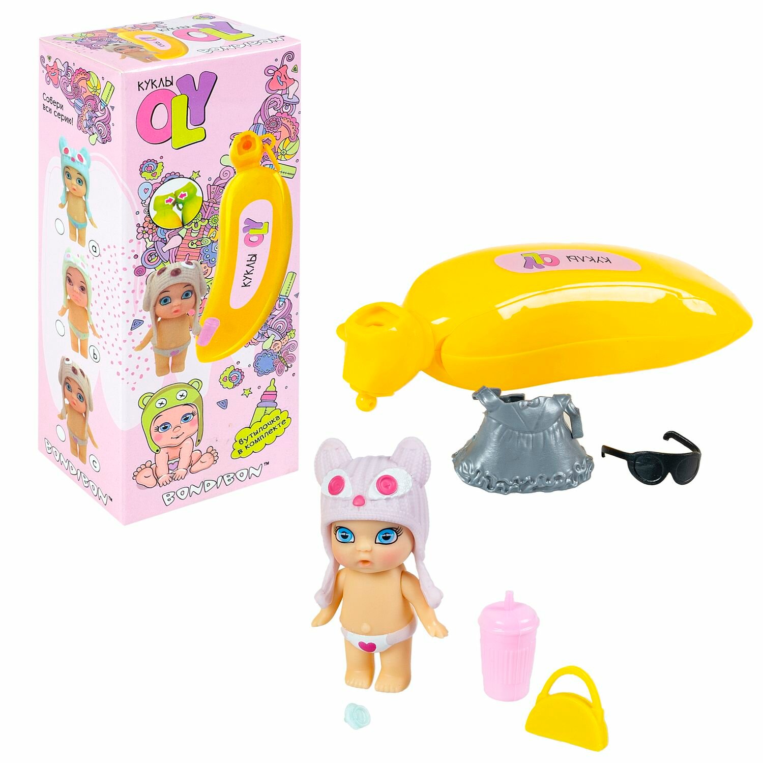 Набор игровой Bondibon куколка OLY в шапочке-ушанке с животным и аксессуарами в банане, ВОХ 15х6,6х1, арт. ВВ3840