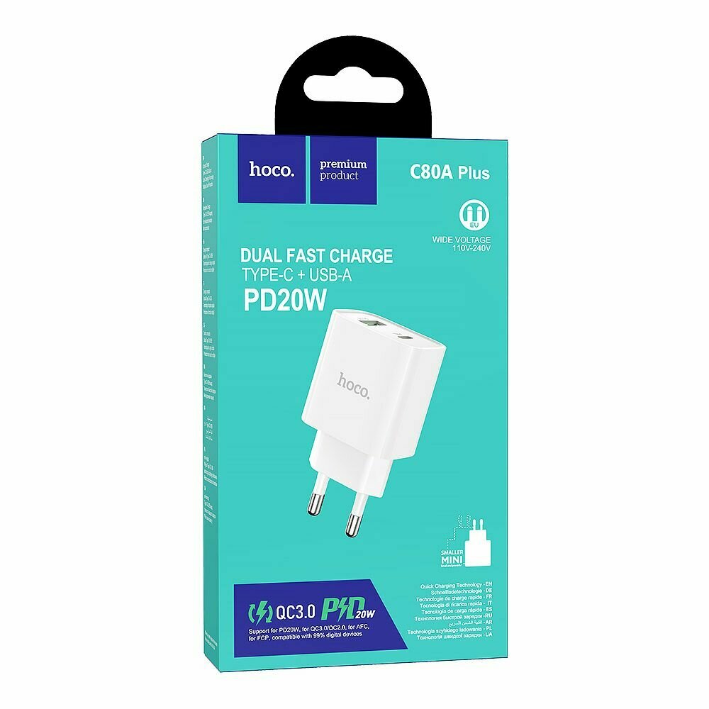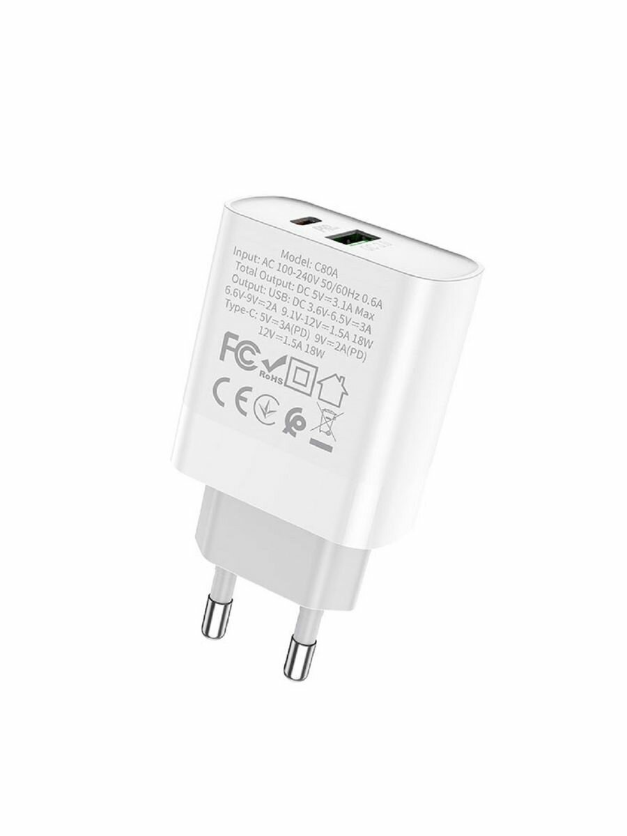 Сетевое зарядное устройство (СЗУ) Hoco C80A (USB+Type-C PD) 3 А, белый