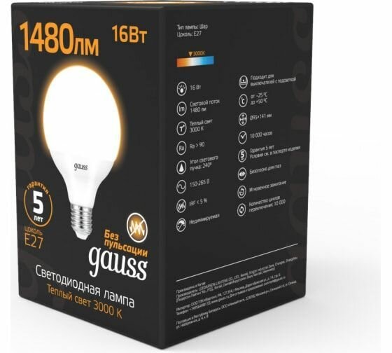 Лампа светодиодная Gauss G95 E27 16W 1360lm 3000K