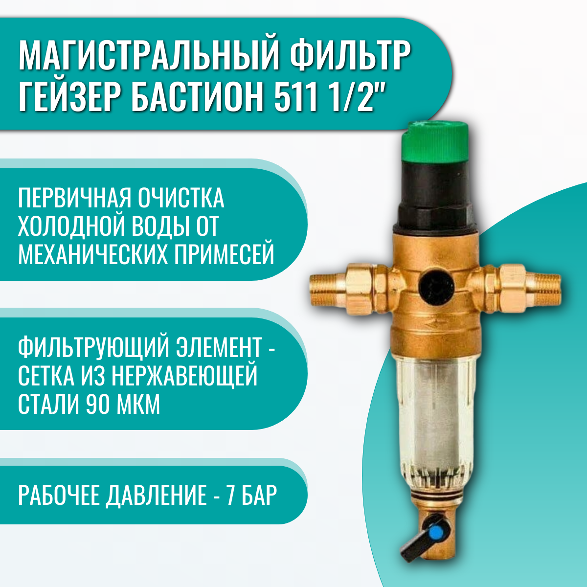 Магистральный фильтр Гейзер-Бастион 7508155233 (1/2 для холодной воды, с регулятором давления, d52,5 .