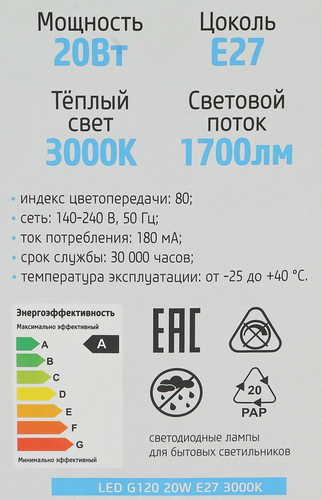 23950_Фотон Лампа Светодиодная Led G120 20W E27 3000K 23950 фотон арт. 23950