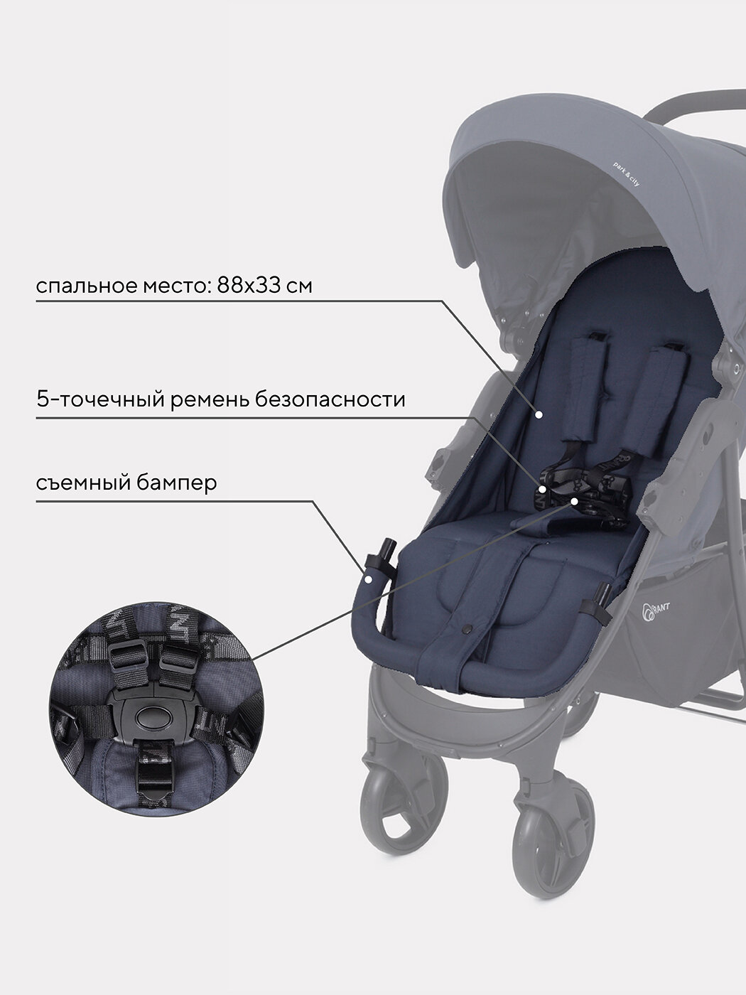 | Особенности | съемный бампер, ремни безопасности, горизонтальное положение спинки, регулировка высоты подножки, мягкие накладки на ремни, смотровое окно |