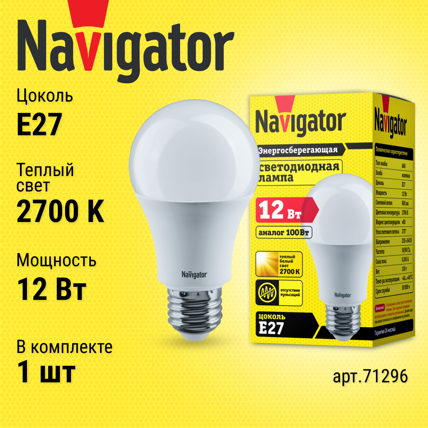 Лампа светодиодная 71 296 NLL-A60-12-230-2.7K-E27 | код. 71296 | Navigator ( 1шт. )