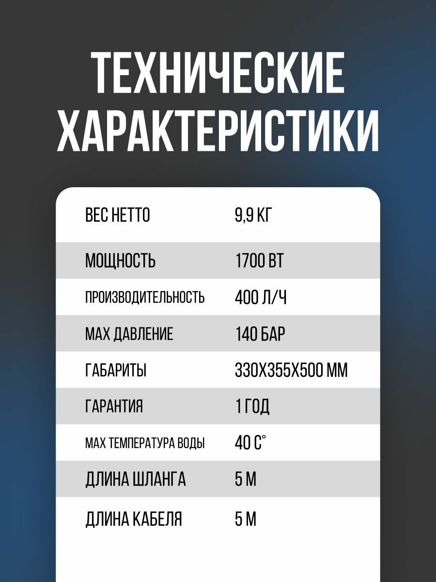| Минусы: | Коротковат шланг высокого давления, не хватает еще двух метров. |