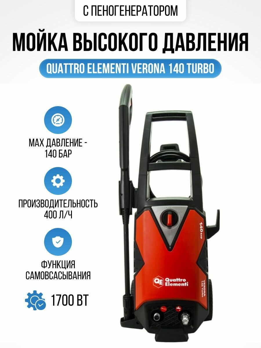 Мойка высокого давления QUATTRO ELEMENTI VERONA 140 Turbo (1700 Вт, 140 Бар, 400 л/час , ротационная насадка)