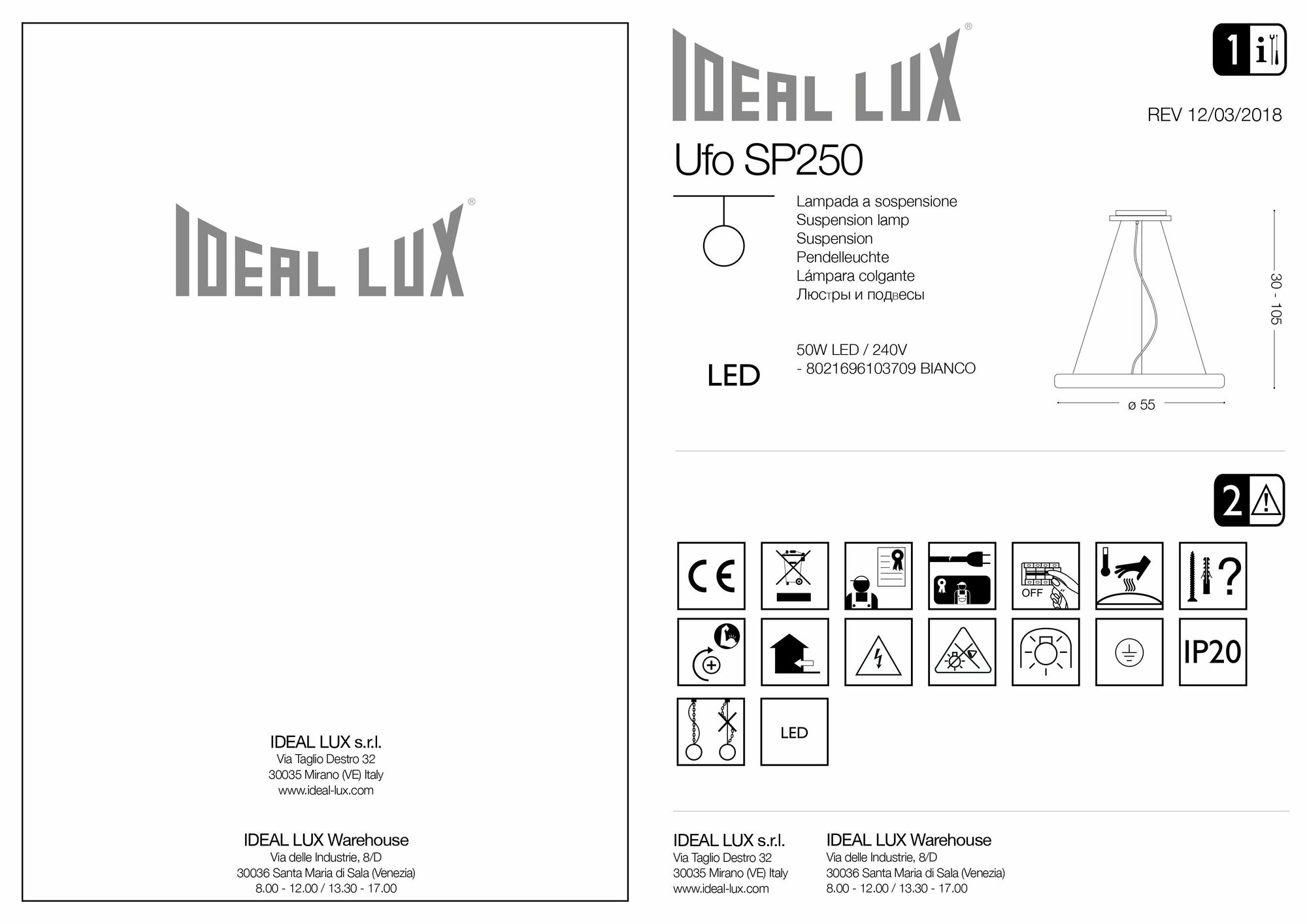 Светильник подвесной ideal lux Ufo SP D55 48.5Вт 4060Лм 3000К IP20 LED 230В Белый Пластик/Металл Не диммируемый 103709.