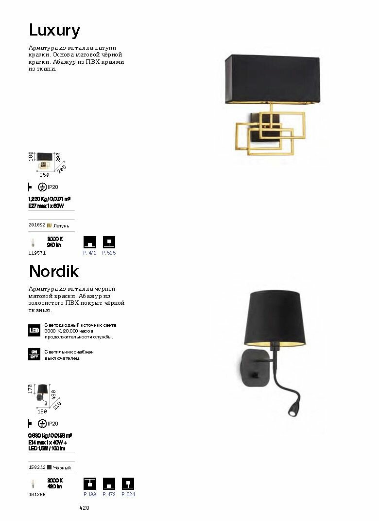Светильник настенный ideal lux Luxury AP1 макс.1х60Вт IP20 Е27 230В Черный/Латунь ПВХ/Металл/Ткань Без лампы 201092.