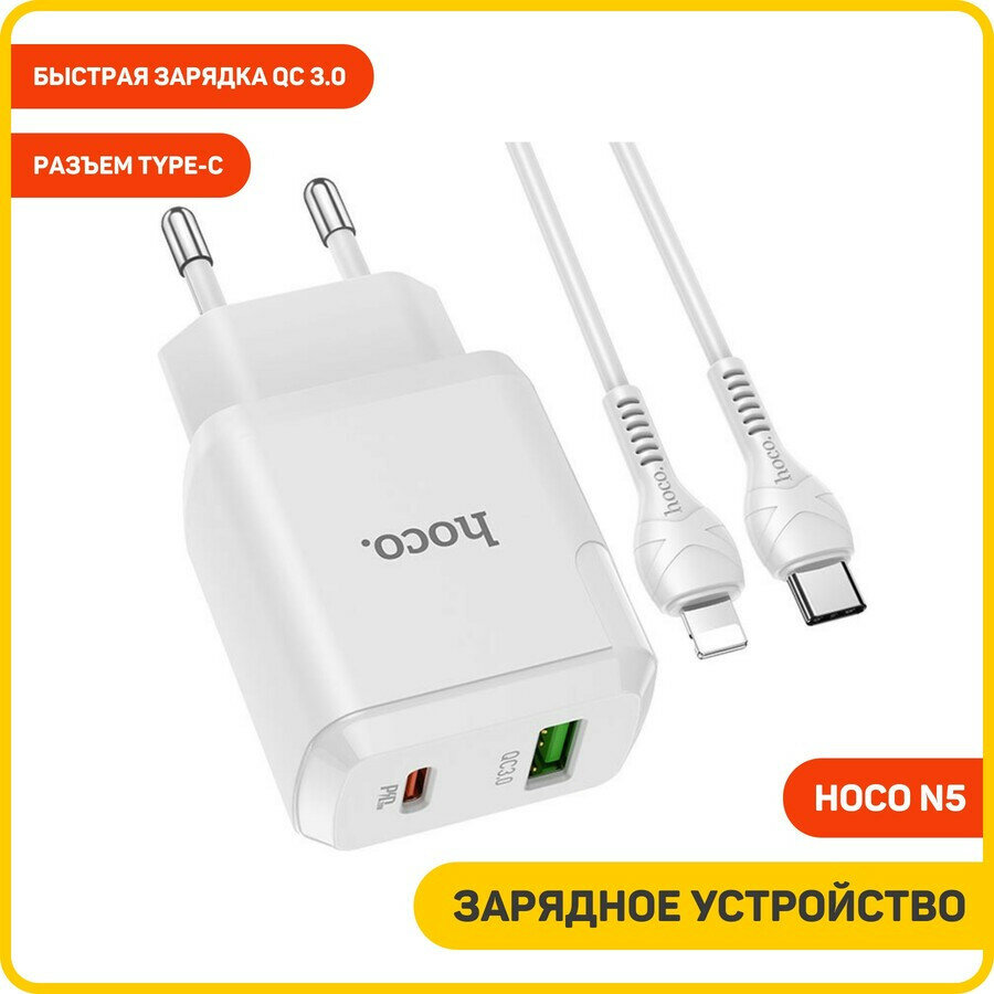 Сетевое зарядное устройство (СЗУ) Hoco N5 (USB+Type-C) + кабель Lightning-Type-C, 3 А, белый