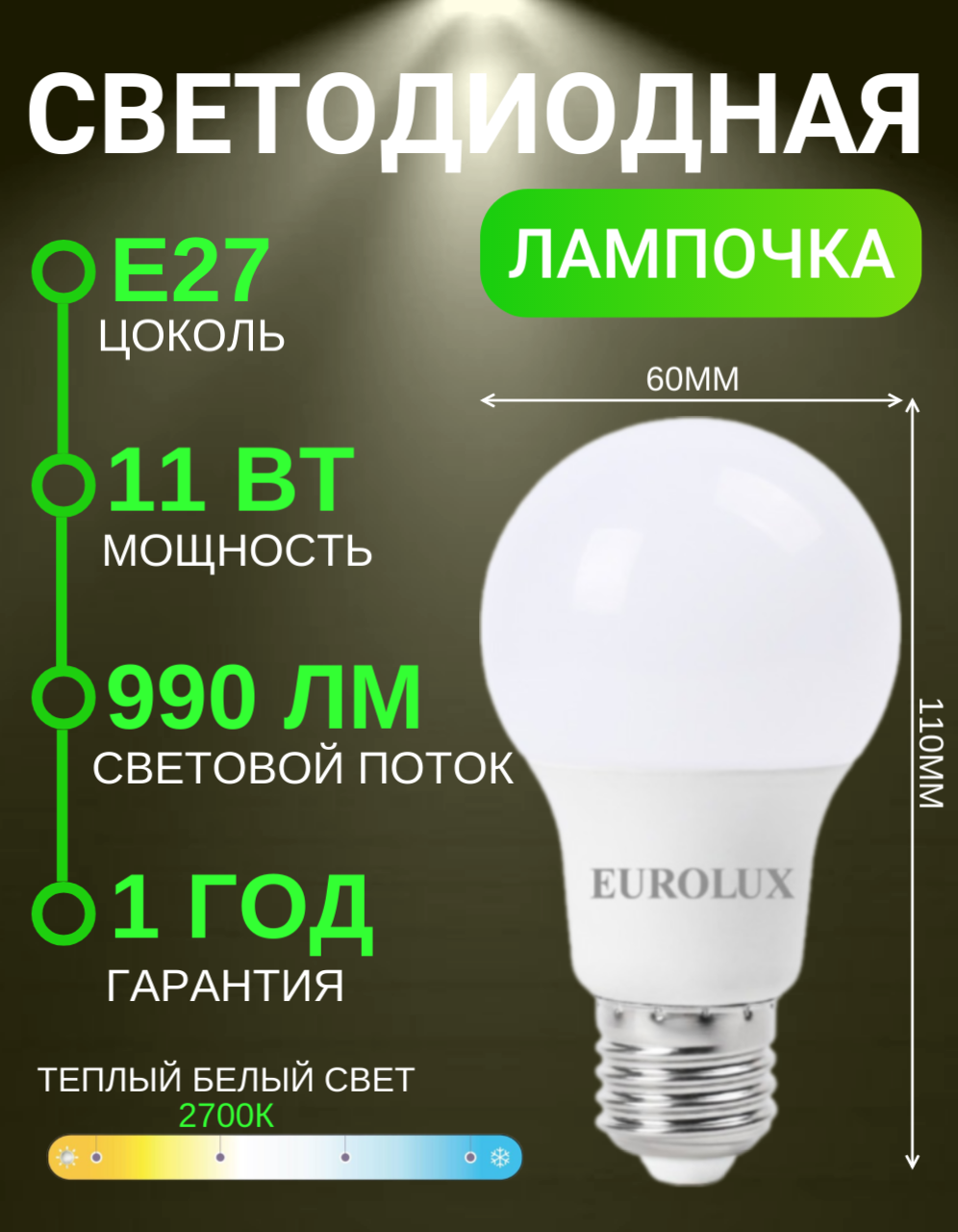 Светодиодная лампа Eurolux ll-e-a60-11w-230-2,7k-e27 76/2/15