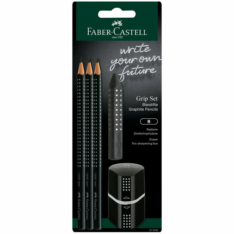 Набор чернографитных (простых) карандашей Faber-Castell Grip 2001 (В, заточенные, ластик, точилка) 3шт., черный блистер (217093)