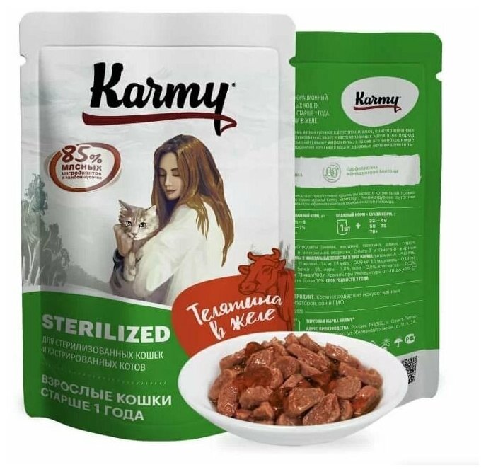 Корм Karmy Sterilized (в желе) для стерилизованных кошек, с телятиной, 80 г x 24 шт