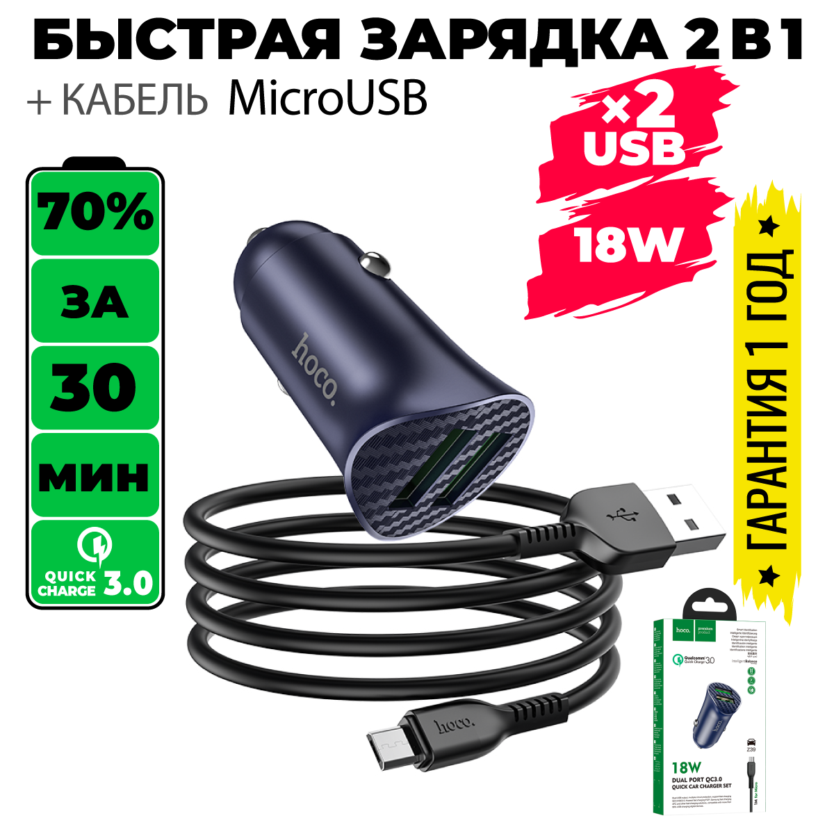Автомобильное зарядное устройство Hoco Z39 Farsighted + кабель microUSB, 18 Вт, черный