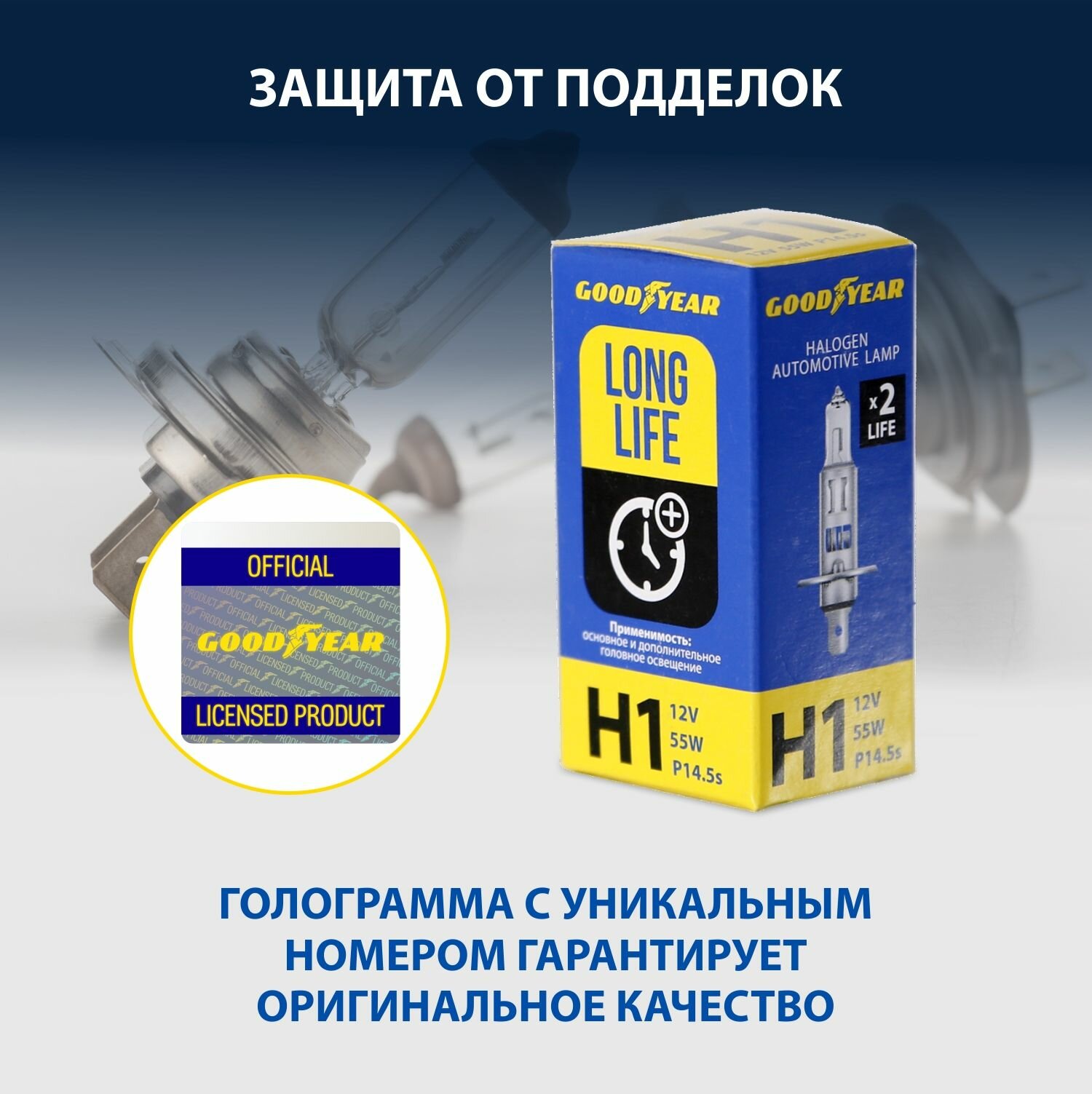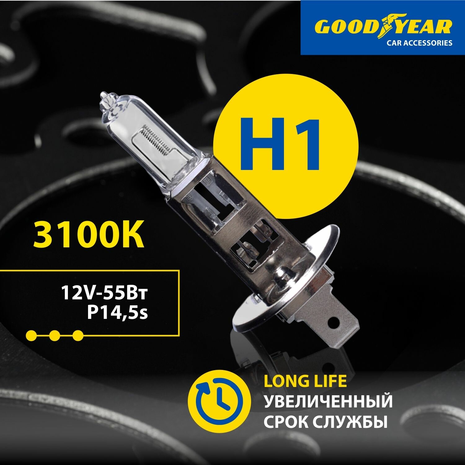 Лампа h1 галогеновая автомобильная Long Life Goodyear 12V 55W P14,5s для LADA ВАЗ 2110-2112, MITSUBISHI Colt, NISSAN Skyline/Teana, RENAULT Kaptur 1 пок/Megane IIб, VOLVO XC90 (птф)