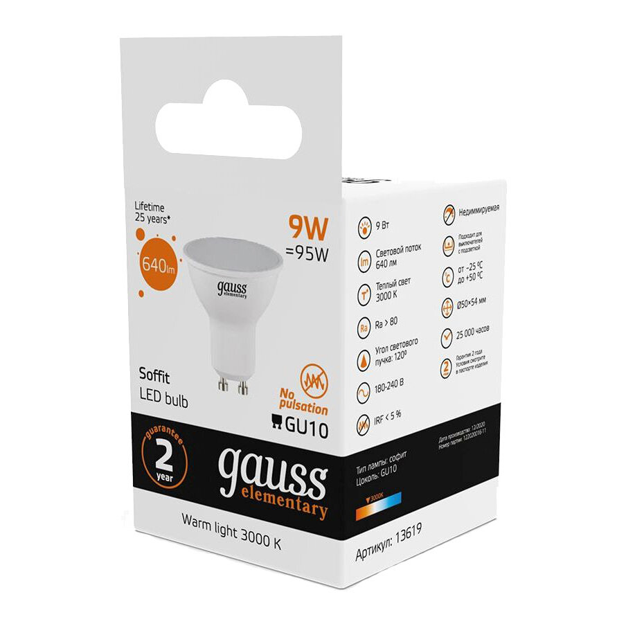 Лампа светодиодная gauss Elementary 13619, GU10, MR16, 9Вт, 3000 К