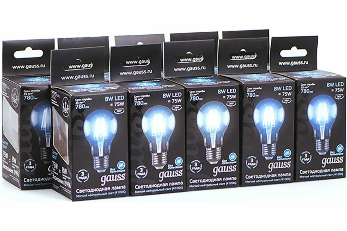 (10 шт.) Светодиодная лампочка Gauss Filament ЛОН A60 E27 8W(780lm) 4100K 4K прозр. 105x60 филамент (нитевидная), 102802208
