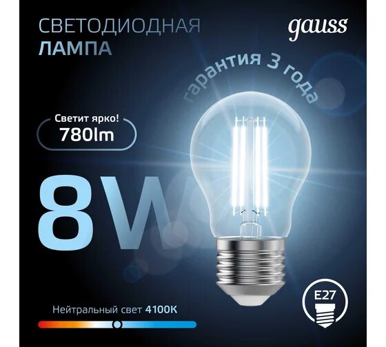Gauss Filament ЛОН A60 E27 8W(780lm) 4100K 4K прозр. 105x60 филамент (нитевидная), 102802208 (арт. 645938)