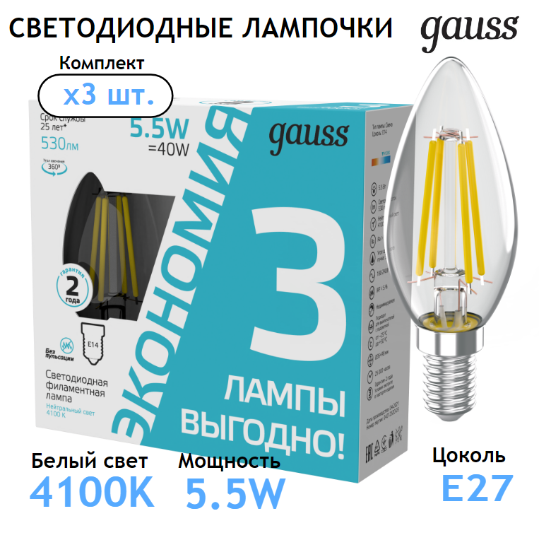 Лампочка светодиодная Е14 Свеча 5,5W Комплект 3 шт. нейтр белый 4100К Gauss Filament