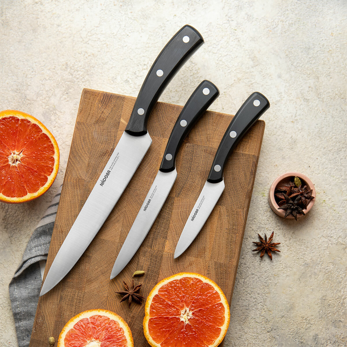 | Типы ножей в наборе | нож для овощей, нож сантоку, разделочный нож, универсальный нож, шеф-нож |