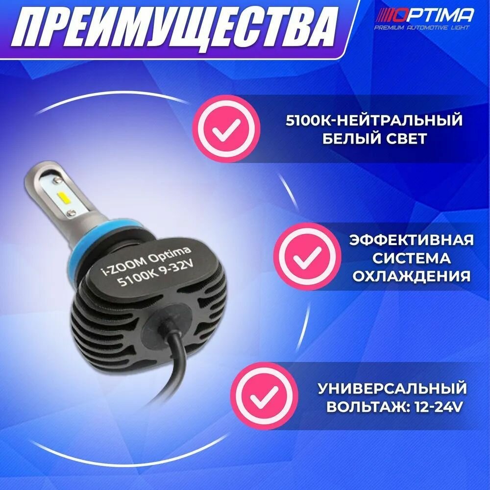 Лампы светодиодные, Optima, H4, LED i-ZOOM, чип Seoul-CSP, White белый свет(5100K). Устанавливаются в машины и мотоциклы с бортовой сетью 12 вольт и 24 вольта , (2 шт.)