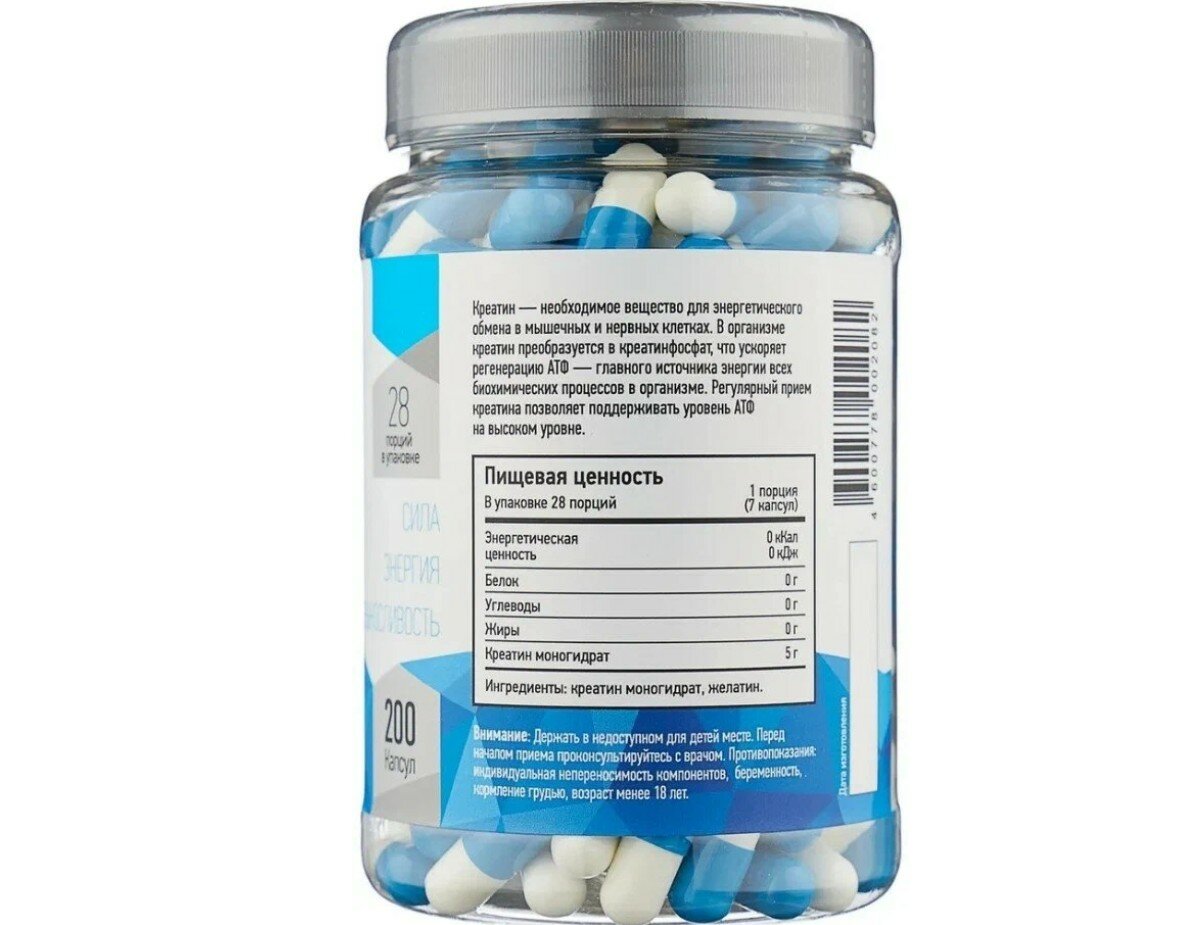 | Дополнительная информация | размер порции: 7 шт.; рекомендации по применению: первый вариант состоит из двух этапов: первую неделю необходимо принимать по 5 грамм креатина 4-5 раз в день, далее следует принимать по 5 грамм 1 раз в день, для поддержания концентрации; второй вариант: прием 5 грамм креатина 1 раз в день в течение, минимум, 30 дней; состав: креатин моногидрат, желатин |