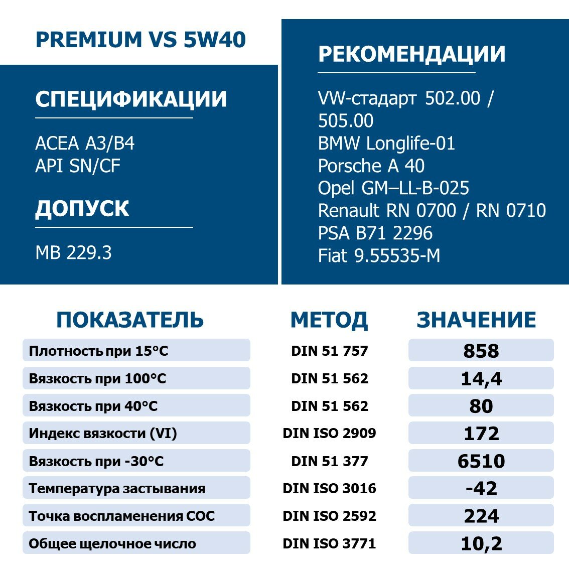| Допуски OEM | VW 502.00/505.00 / PSA B71 2296 / BMW Longlife-01 / Renault RN 0710 / PORSCHE A40 / MB 229.3 / Renault RN 0700 / GM-LL-B-025 / FIAT 9.55535-M2 |