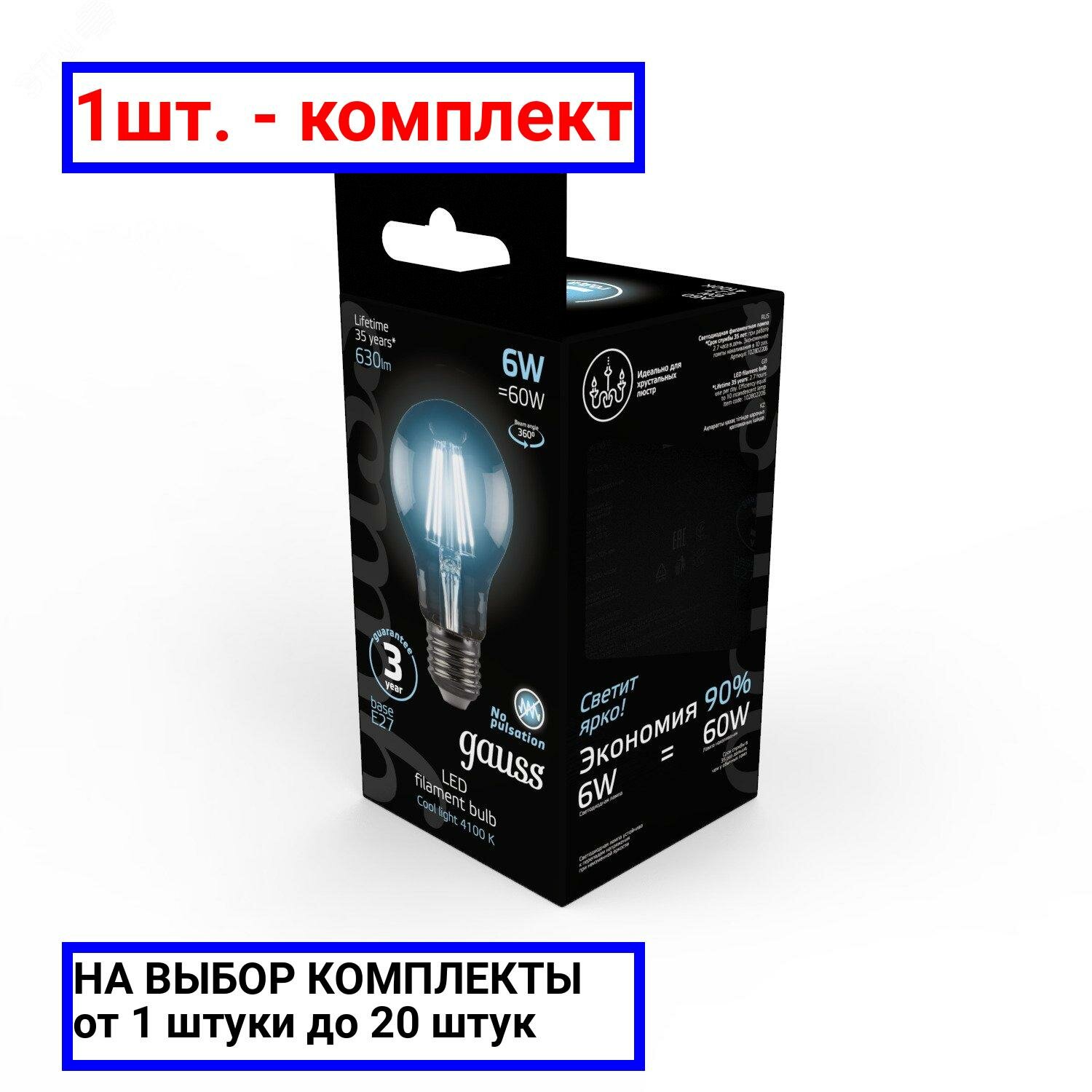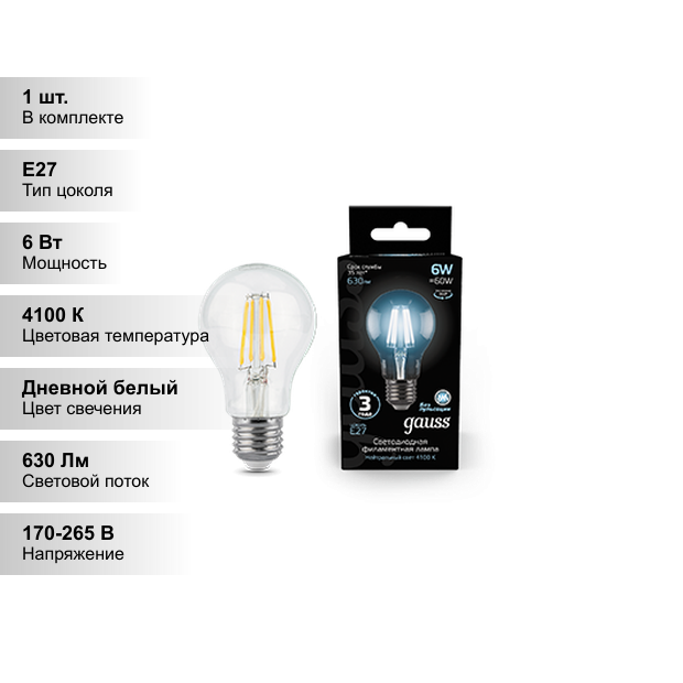 (3 шт)Лампа Gauss Filament А60 6W 630lm 4100К Е27 LED 1/10/40