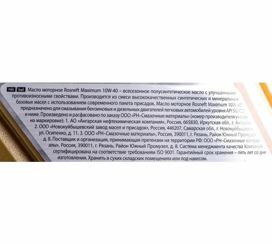 Масло моторное роснефть MAXIMUM полусинтетическое 10W40 1л