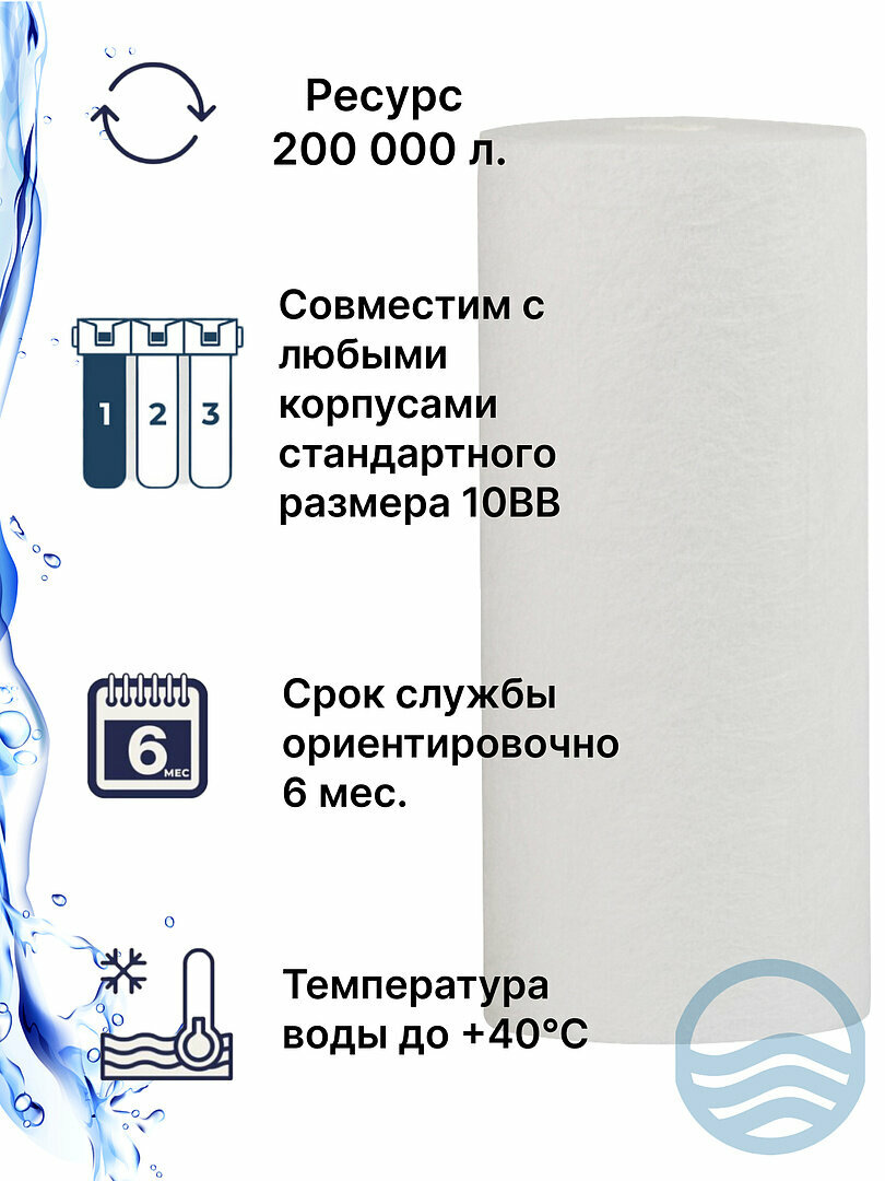| Плюсы: | Функцию свою выполняет - задерживает мелкую взвесь в воде. Используется в магистральном фильтре, чтобы увеличить срок службы фильтра для подготовки питьевой воды. |