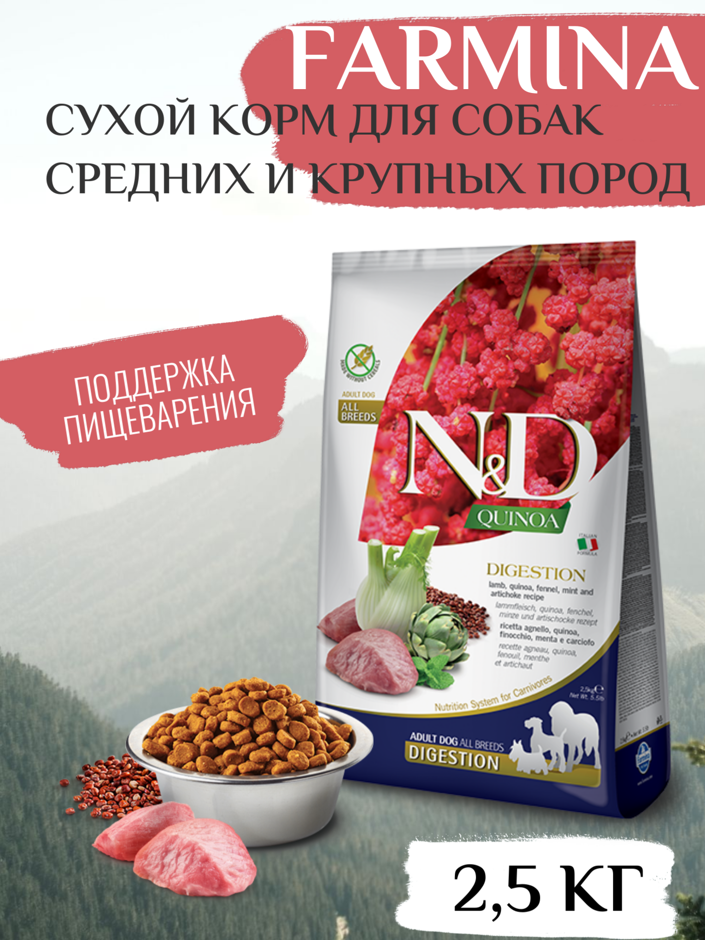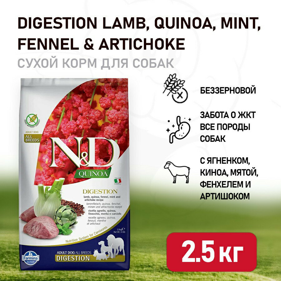 Farmina N&D Quinoa Dog Grain Free Digestion сухой беззерновой корм для взрослых собак для поддержки пищеварения с ягненком и киноа - 2,5 кг