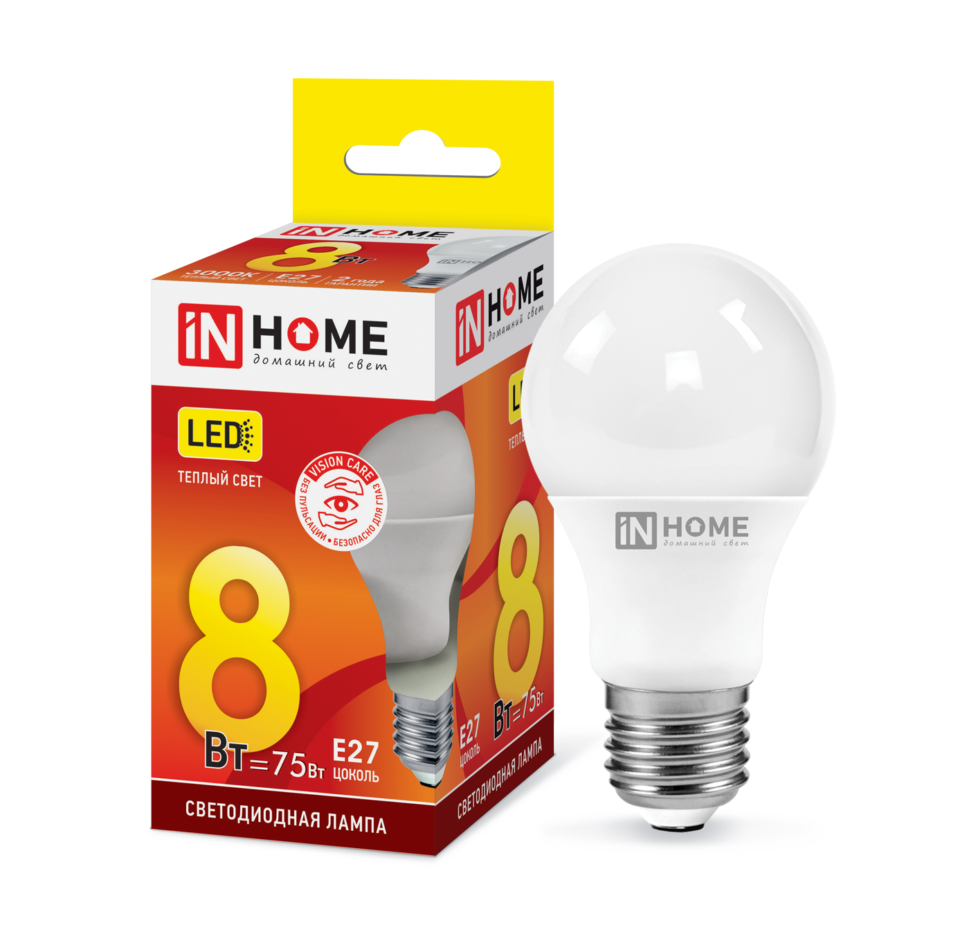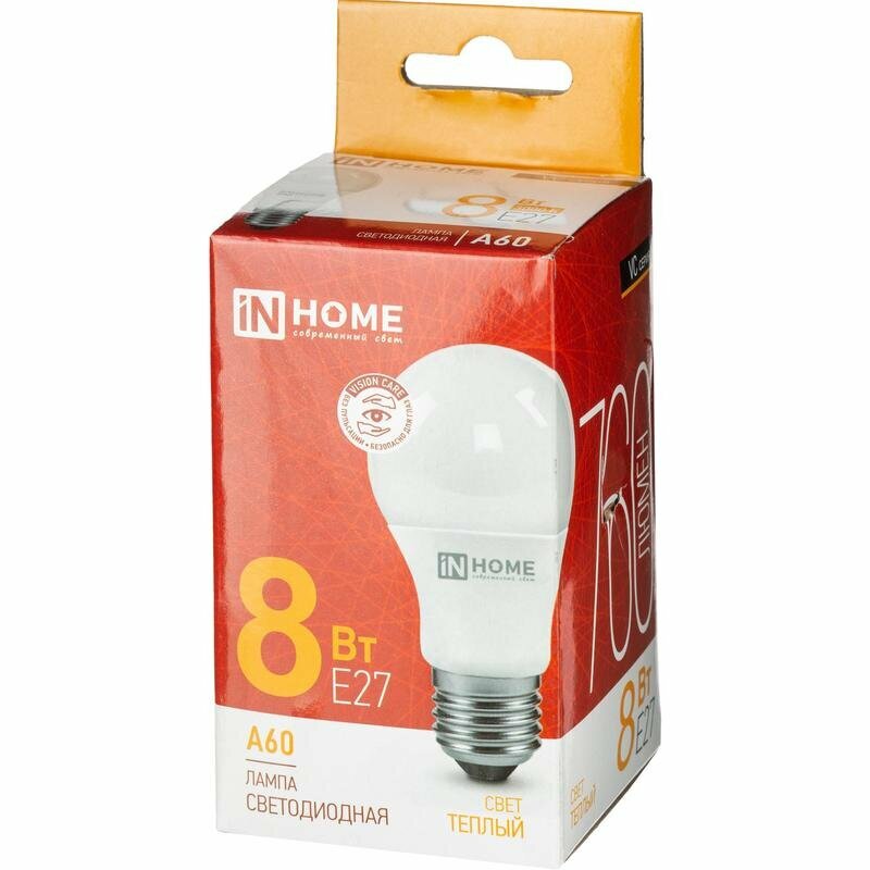 Лампа светодиодная IN HOME LED-A60-VC, 8 Вт, 230 В, Е27, 3000 К, 760 Лм