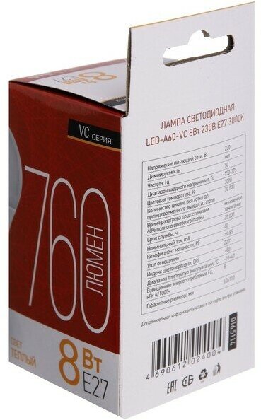 Лампа светодиодная LED-A60-VC 8Вт грушевидная 3000К тепл. бел. E27 760лм 230В IN HOME 4690612024004