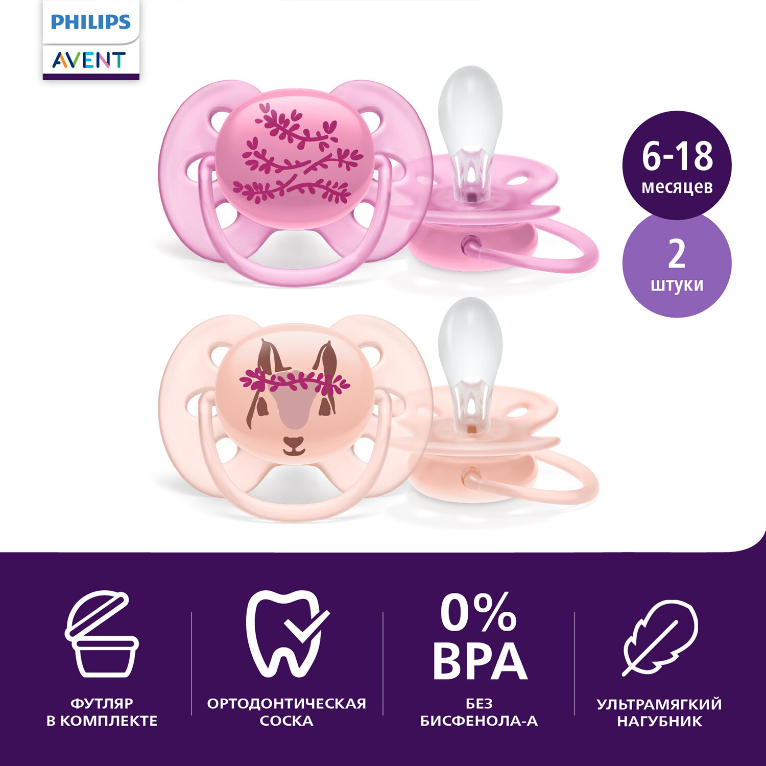 Philips Avent Пустышка ultra soft для девочки 6-18 мес 2 шт в комплекте с футляром для хранения и стерилизации