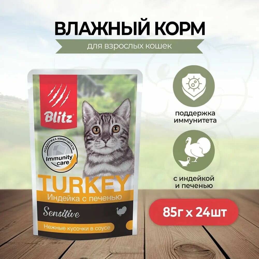 Влажный корм для кошек Blitz при чувствительном пищеварении, с индейкой, с печенью 24 шт. х 85 г (кусочки в соусе)