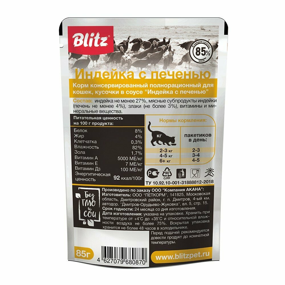 Консервы BLITZ для кошек Индейка с Печенью в соусе пауч 85г (24 шт. в упаковке)