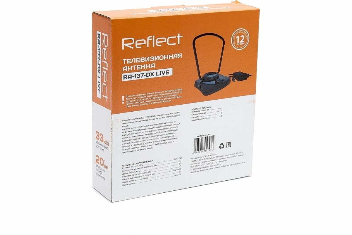 REFLECT 4603225017905 REFLECT LIVE RA-137-DX (активная, 5V, ДМВ, с б/п, 33 дБи, коробка) Антенна комнатная