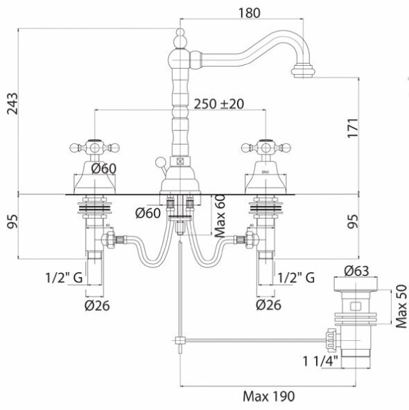 Смеситель для раковины Cezares Golf на 3 отверстия, с донным клапаном (Golf-BLS2-02)