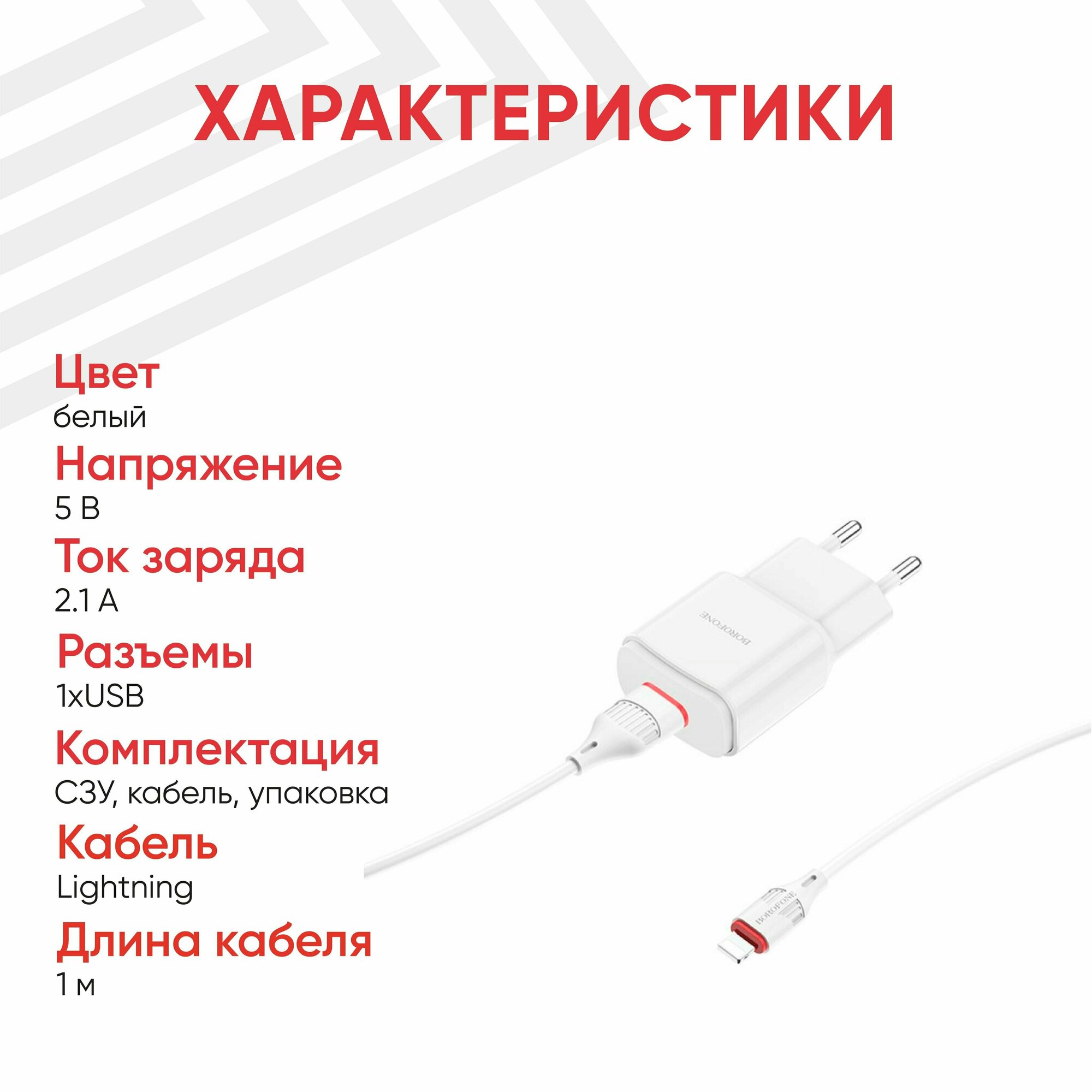 Адаптер Сетевой с кабелем Borofone BA48A Orion 1 USB / 5V / 2.1A + Lightning Белый
