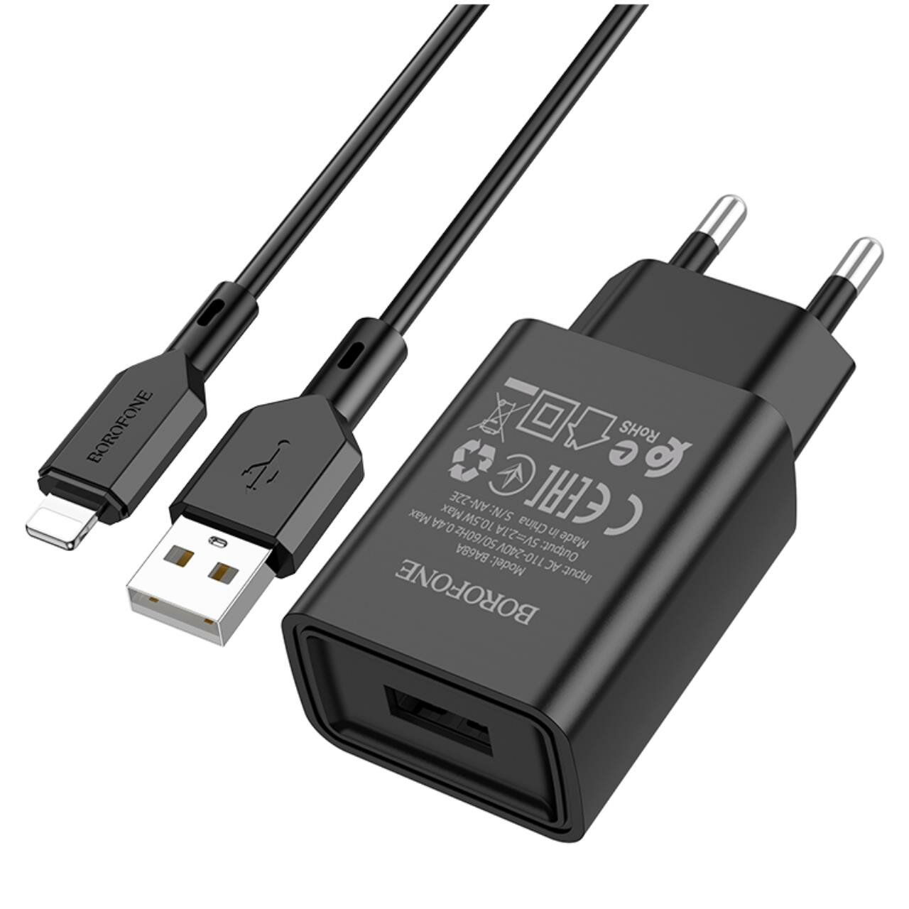 Сетевое зарядное устройство Borofone BA68A с портом USB и кабелем Lightning, black