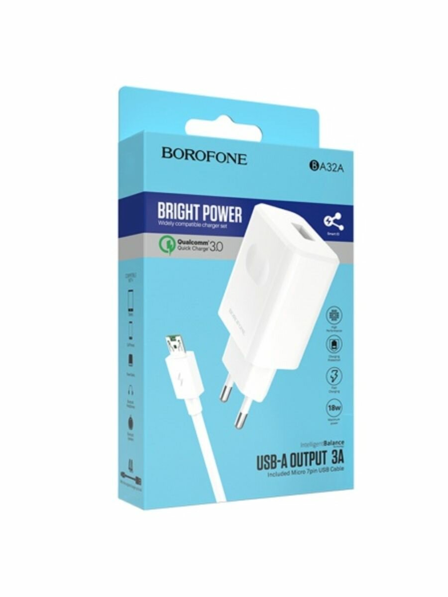 Сетевое зарядное устройство Borofone BA32A Bright Power 1xUSB QC3.0, 18W, 3А + кабель MicroUSB, 1м, белый