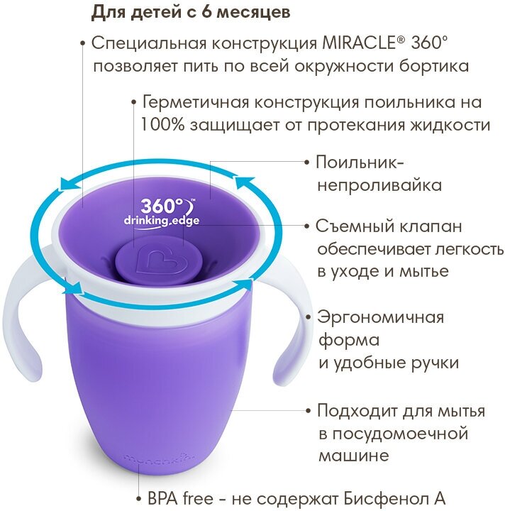Поильник с крышкой MIRACLE 360° Munchkin непроливайка, с ручками, 207мл. 6мес+, фиолетовый