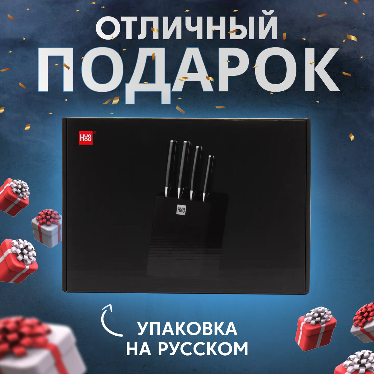 Набор стальных ножей (4 ножа + подставка) Xiaomi (Mi) HuoHou Composite Steel Kitchen Knife Set (HU0033), русская версия!!!, черный