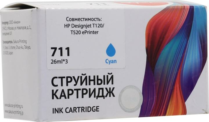 Набор струйных картриджей Sakura CZ134A (№711 Cyan 3-pack) для HP Designjet T120/T520 ePrinter, водорастворимый тип чернил, голубой, 26 мл.
