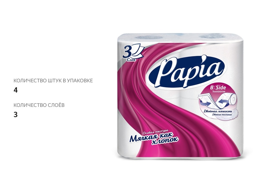 Бумага туалетная бытовая, спайка 4 шт., 3-слойная (4 х 16,8 м), PAPIA, белая, 5058528 (цена за 1 ед.товара)