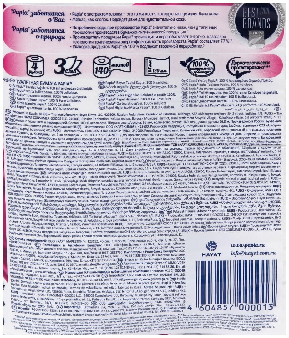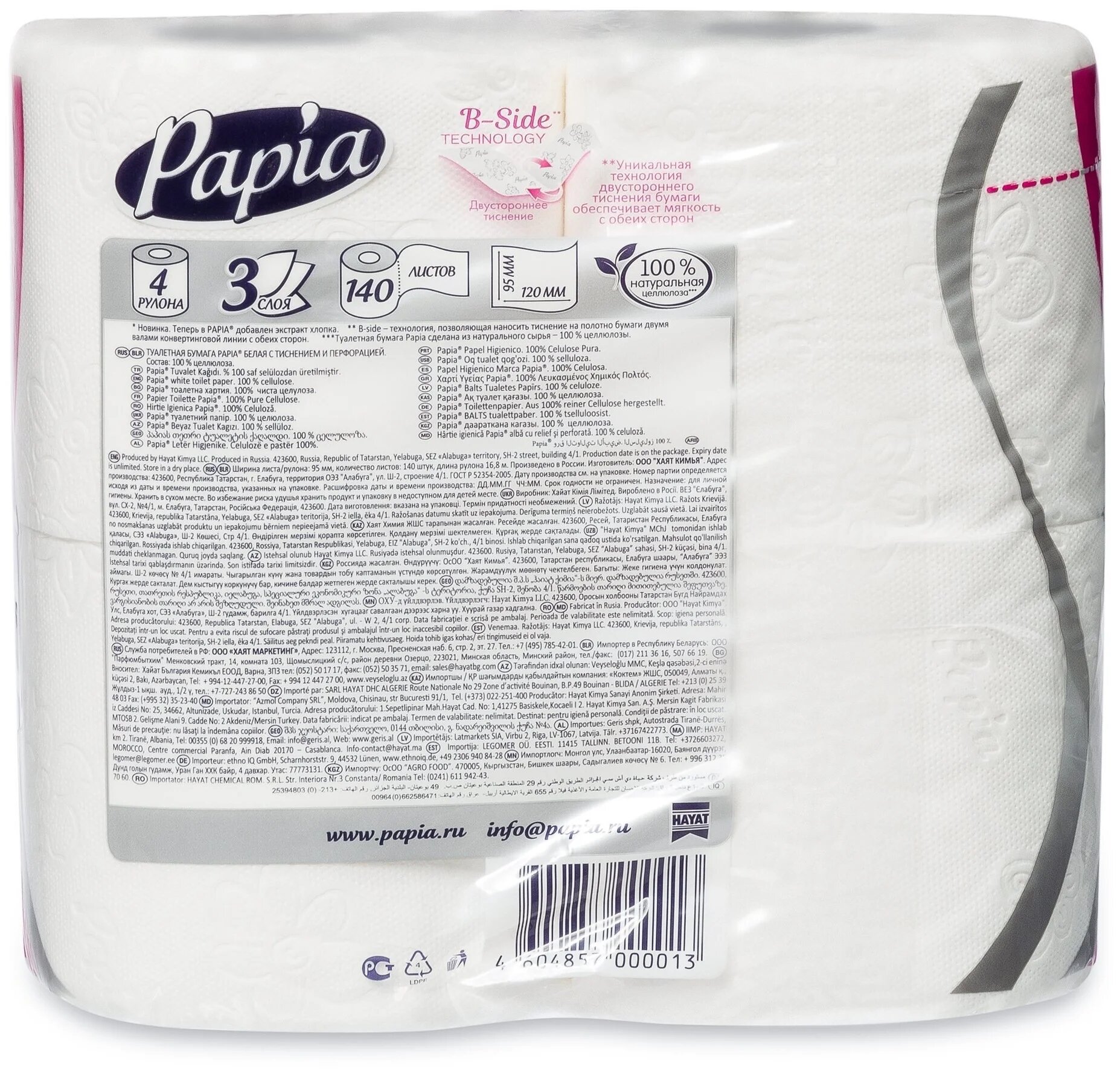 HAYAT 'Papia ' Туалетная бумага белая трёхслойная, 4 шт