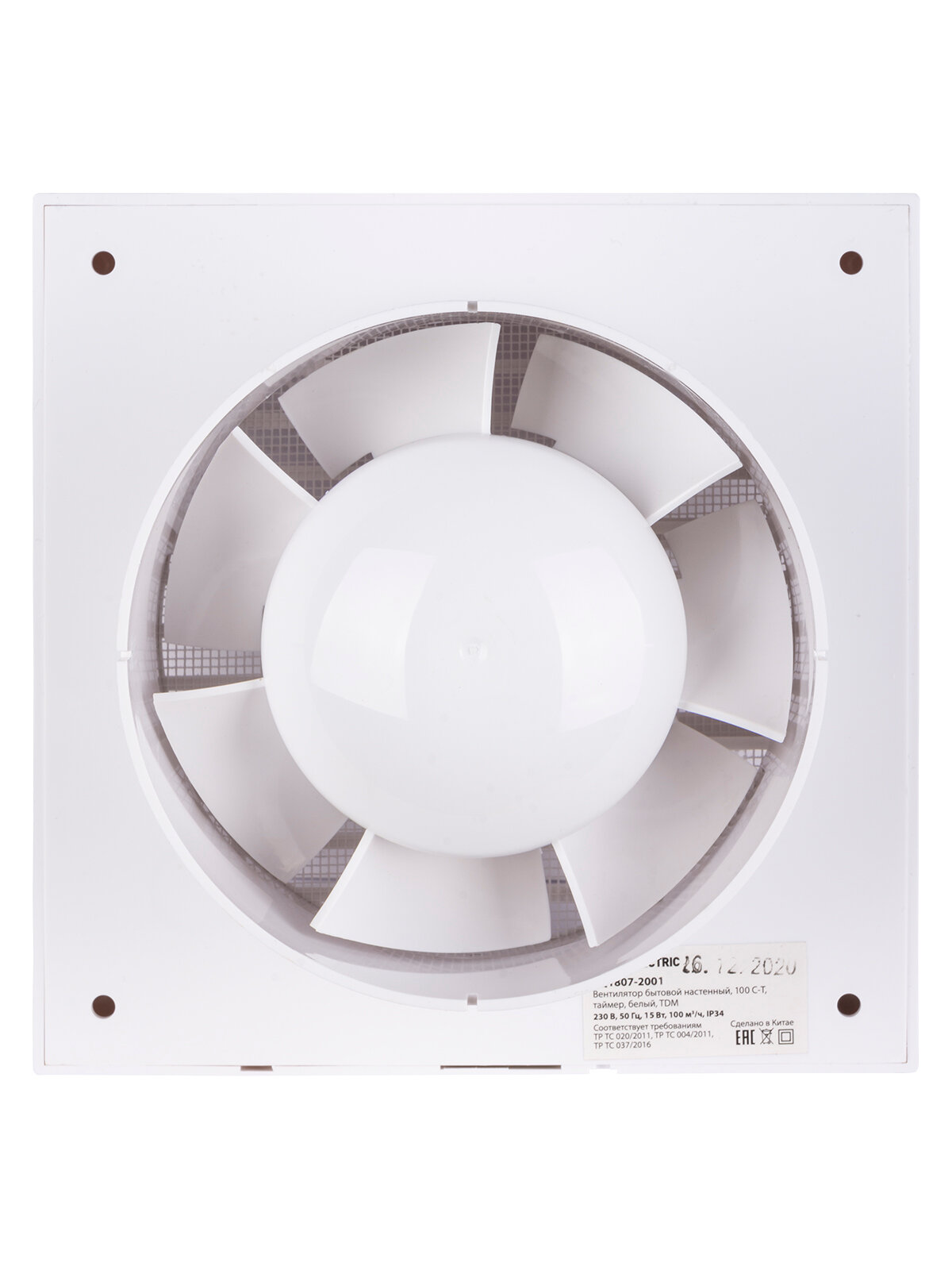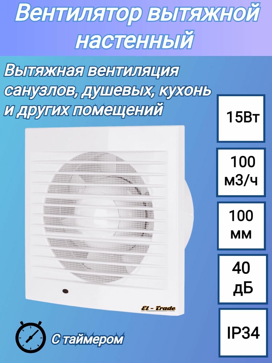 Вентилятор вытяжной бытовой настенный с таймером, установочный диаметр 100 мм, белый, IP34, 15Вт, 157х157х76 мм