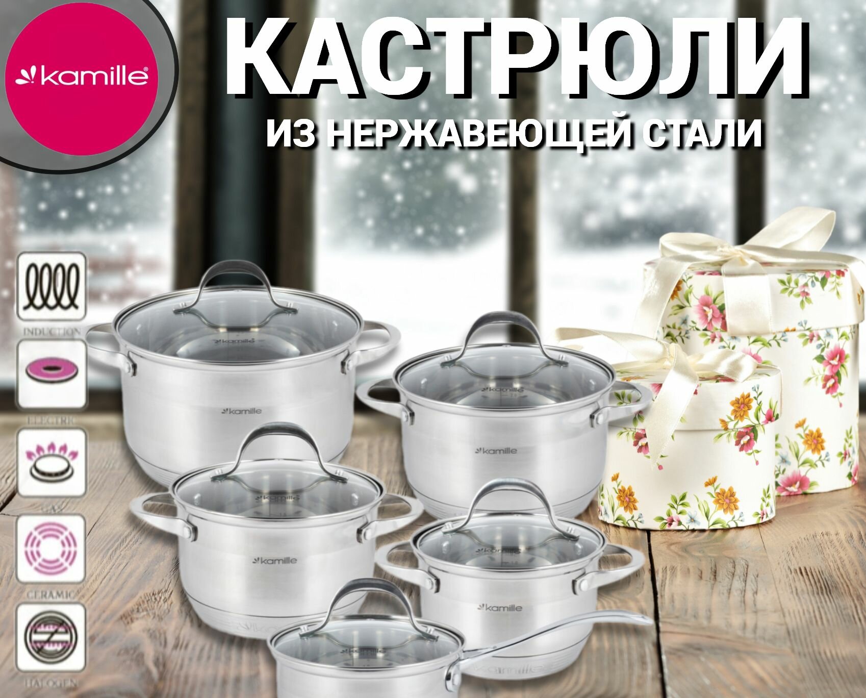 Купить Набор посуды 10 предметов Kamille KM 4710S из нержавеющей стали (ковш 1,8 л; кастрюли 1,8 л; 2,3 л; 3,3 л; 5,8 л; 7-слойное дно) (4710S / серебристый)